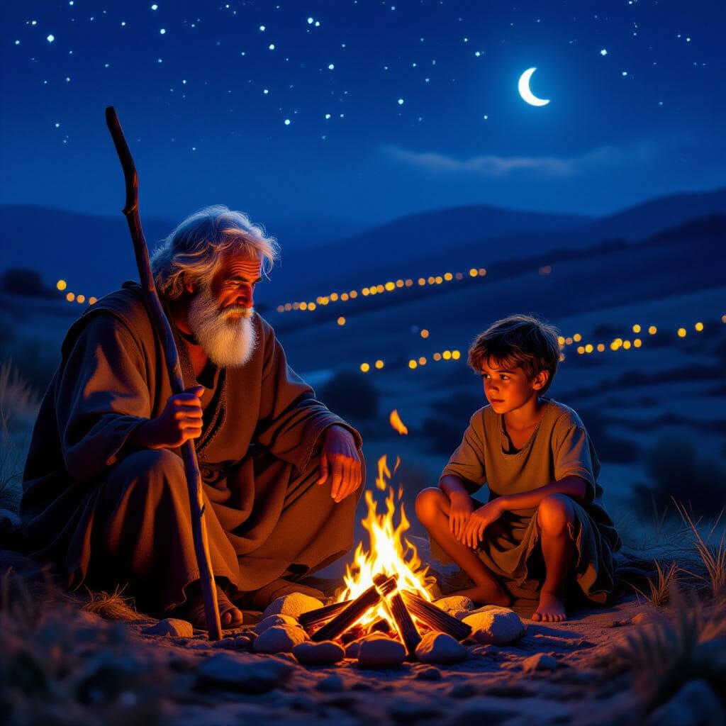 O ancião observava-o, o olhar sereno varrendo a paisagem antes de pousar no rapaz. As rugas de seu rosto, marcas de sol e tempo, pareciam se aprofundar à luz bruxuleante. O silêncio, apenas quebrado pelo estalar da lenha e pelo lamento distante de uma ovelha, estendeu-se denso.